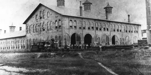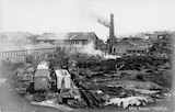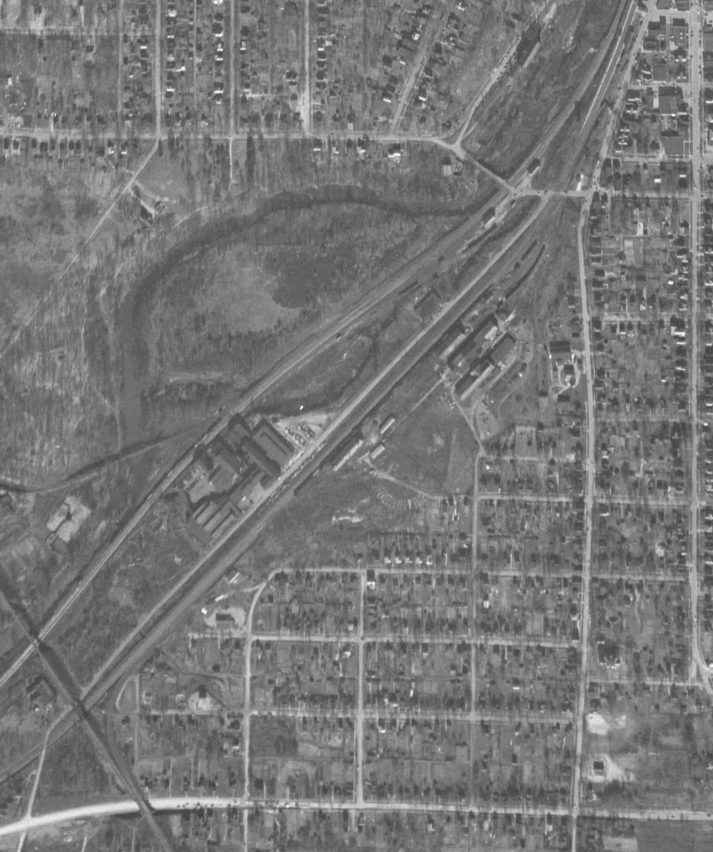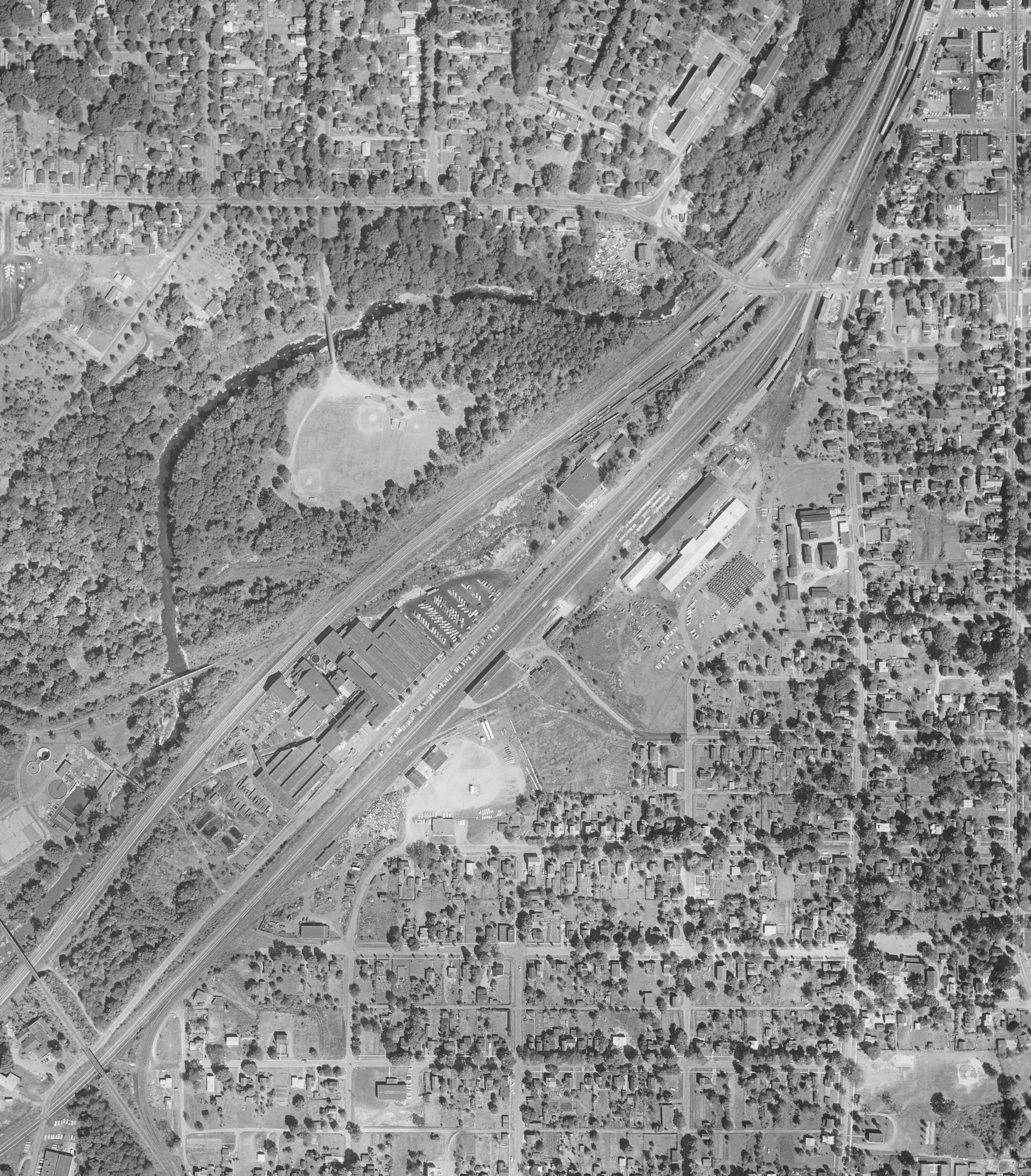 Looking south. Two buildings circled: left is standing and was the planing shop. Right circled no longer standing. Refer to Sanborn insurance maps for more detail. Erie RR or A&GW era?