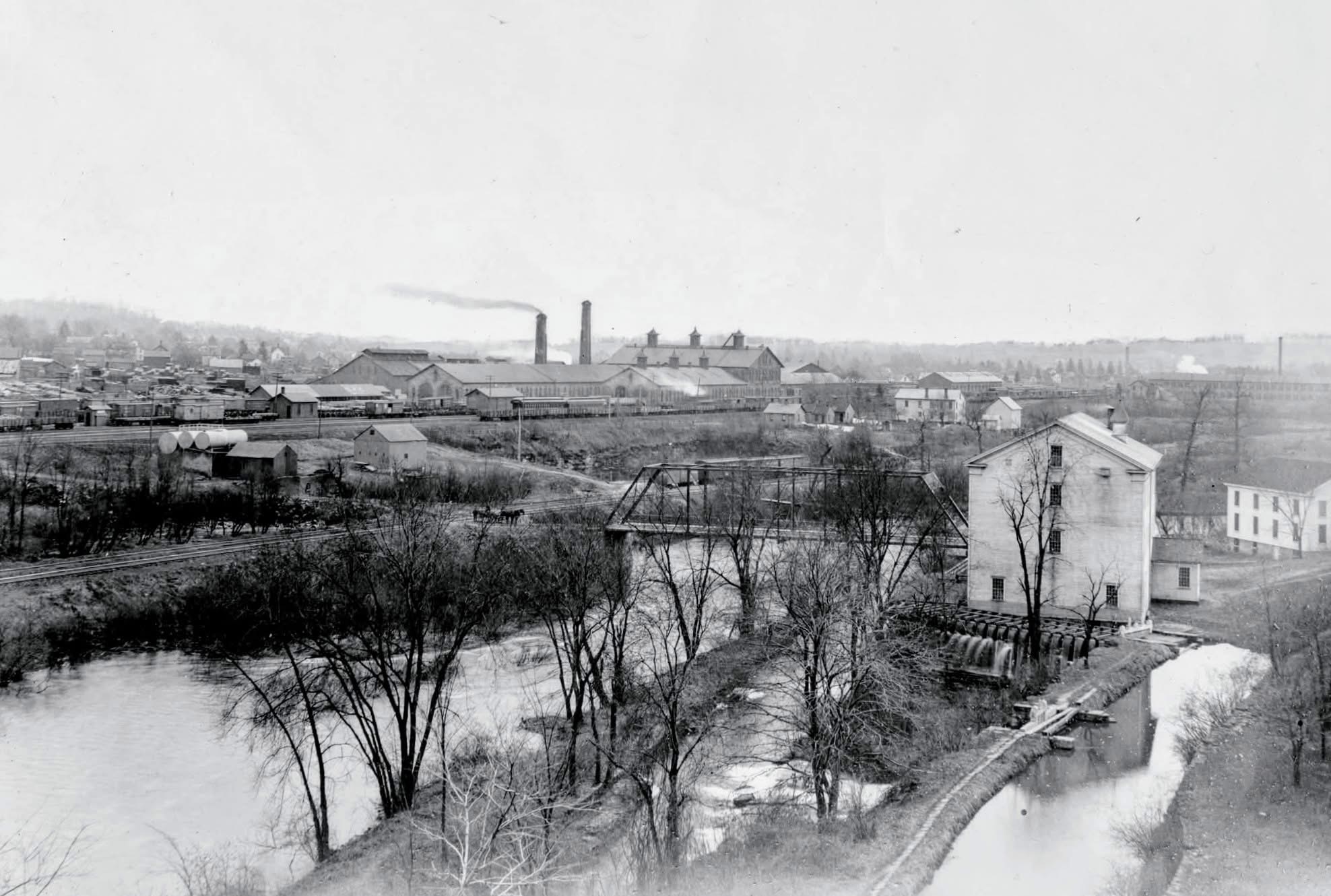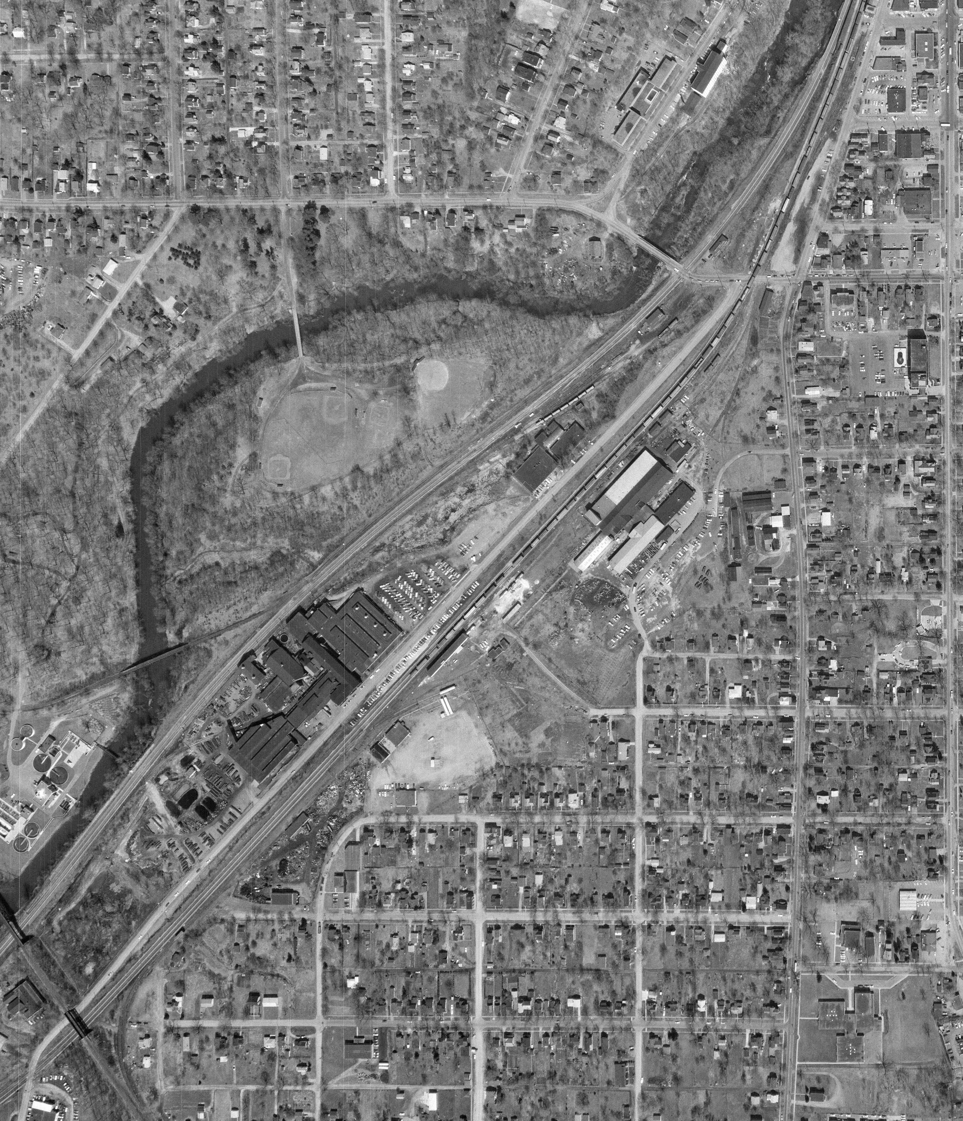 Distant view looking south at rail yard (not sure if A&GW RR or Erie RR era).